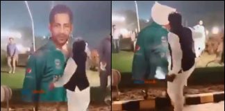 కటౌట్ని తన్నిన అభిమాని! పాక్ కెప్టెన్ సర్ఫరాజ్ అహ్మద్, కోచ్ మిస్బావుల్ హక్పై అభిమానులు...